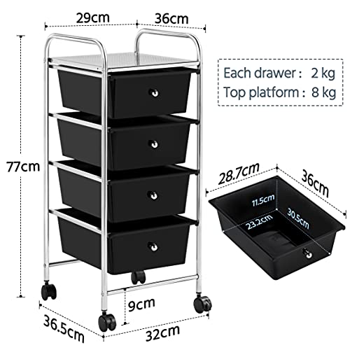 Onze trolley is gemaakt van kunststof en metaal en kan maximaal tot 8 kg worden belast. Deze opbergwagen beschikt over 4 zwenkwielen (2 met remmen), zodat je de trolley naar wens op verschillende plaatsen kunt plaatsen en indien nodig vrij naar wens kunt positioneren. De 4 laden bieden je bovendien veel opbergruimte voor vaak gebruikte voorwerpen. De kunststof serveerwagen is ook licht en eenvoudig te reinigen.