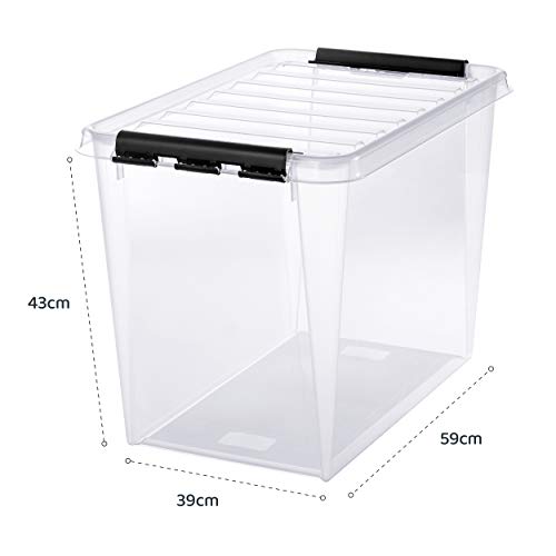 HOOGWAARDIGE OPBERGBOXEN 61l – Opbergboxen van SmartStore houden je huis en kantoor perfect opgeruimd. Ideaal voor het opbergen van speelgoed, boeken, kleding en administratie. En het belangrijkste is dat opbergboxen van SmartStore ook goedgekeurd zijn voor het veilig bewaren van levensmiddelen. Afmetingen: buitenkant: L59 x B39 x H43 cm. Binnenkant: L46,6 x B28,4 x H39,1 cm.